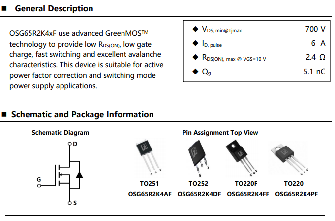 | TO-220F | OSG70R600FF | Production | N | 700 | 30 | 8 | 28 | 3.4 | 0.60 | 12.2 | 2.9 | 4.9 |